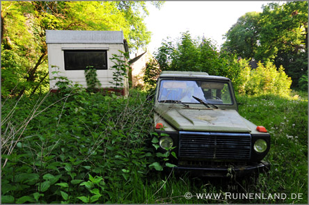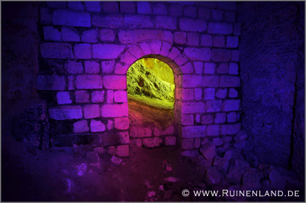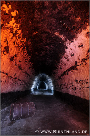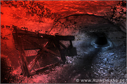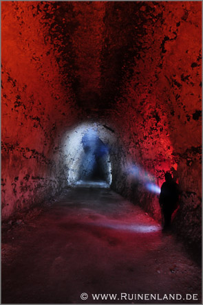 Die Urbexer, die wir anfangs in der ersten Grube trafen, hatten uns noch von einem nahe gelegenen Tunnel erzählt, den wir nun als nächstes aufsuchen wollten. Laut ihrer Aussage handelte es sich hierbei um einen Bahntunnel, die Beschaffenheit der grob behauenen Wände und die anfangs geringe Höhe ließen jedoch eher auf eine andere Nutzung schließen. Die gesamte Länge von knapp 2 Km wollten wir nicht mehr durchschreiten, aber zumindest etwa das erste Drittel nahmen wir uns vor. Wie sich herausstellte, handelte es sich um ein doppeltes Gangsystem, an dessen Eingang ein altes, verrostetes und in sich zusammengebrochenes Auto stand. Mittels Taschenlampen, farbigem Licht und Mehrfachbelichtungen gestalteten wir unsere Aufnahmen.
