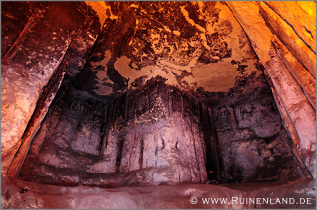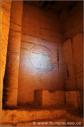 Wir wollten die Höhle gerade wieder verlassen, als sich von außen Stimmen näherten. Ein zugegeben etwas mulmiges Gefühl. Es handelte sich jedoch lediglich um andere Urbexer, die wir schließlich zur zweiten Grube begleiteten. Es war nicht ihr erster Besuch und sie führten uns u.a. zu einem Brunnen und einem in die Wand gearbeiteten Maya-Relief. Zudem unterstützen sie uns netterweise mit ihren stärkeren Lampen bei der Ausleuchtung unserer Fotos. Leider mussten sie irgendwann gehen und ihre Rückfahrt nach Deutschland antreten. So folgten wir ihnen zum Ausgang, "malten" auf dem Weg Pfeile in den staubigen Boden und erforschten einen kleinen Teil der Gänge später nochmals auf eigene Faust. Einer der Durchgänge glich optisch den Umrissen einer Geige, an den Wänden fanden sich immer wieder Zeichnungen sowie eingeritzte Gesichter und Fratzen. Wer weiß, was sich in der Vielzahl von Gängen, die wir nicht gesehen haben, noch alles an Kunstwerken verbirgt? An manchen Stellen befinden sich gar altertümliche Höhlenmalereien und mittelalterliche Zeichnungen, die wir allerdings leider nicht fanden; zumal wir nicht wussten, in welcher der drei Gruben diese sind. Wichtig zu wissen ist, dass sich die Eingänge aller Schächte auf der Ostseite des Berges befinden, einen Kompass sollte man zur Sicherheit also in jedem Fall dabei haben. Ebenso einen Pulli, denn in Kühle des Berges war von den heißen Außentemperaturen rein gar nichts mehr zu spüren.