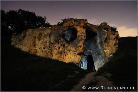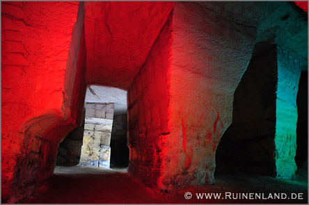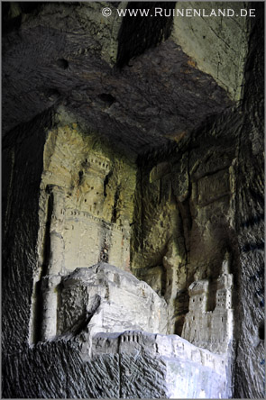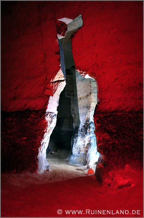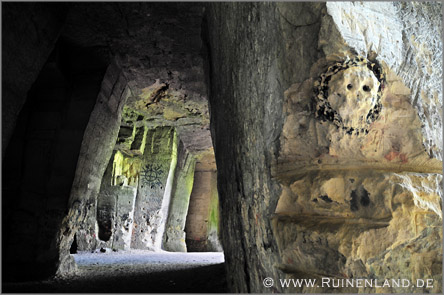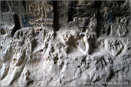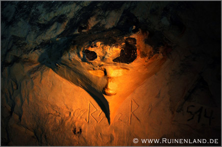 Auch hier fanden sich an den Wänden eine Vielzahl von Skulpturen - Gesichter, eine Burg, Schädel, geometrische Formen und vieles mehr. Ärgerlicherweise waren diese Höhlen, im Gegensatz zu den anderen beiden Gruben, an vielen Stellen großflächig mit Graffiti beschmiert. Teelichter, Getränkedosen und Müll zeugten zudem von unzähligen hier abgehaltenen Partys. Auch Pfeile in allen Farben und Richtungen waren bis in die Tiefen der Gruben an die Wände gesprüht; derart verwirrend, dass man sich kaum noch danach richten konnte. Ich orientierte mich an einem weißen Pfeil, der aufgrund eines Punktes an dessen Ende noch ein wenig heraus stach, um letztendlich nicht völlig planlos durch die verzeigten Schächte zu laufen. Irgendwann endeten diesen Pfeile jedoch, sodass wir schließlich den Rückweg antraten. Dabei flatterten, wie schon in den anderen Gruben zuvor, mehrfach Fledermäuse an uns vorüber. An dieser Stelle die Anmerkung, dass Höhlen, Schächte und dergleichen zum Schutz dieser Tiere von Ende Oktober bis Ende März generell nicht betreten werden sollten! Andernfalls besteht die Gefahr, dass die Fledermäuse aus ihrem Winterschlaf erwachen und daraufhin verenden, da sie in den Wintermonaten keine Insekten zum Fressen finden.