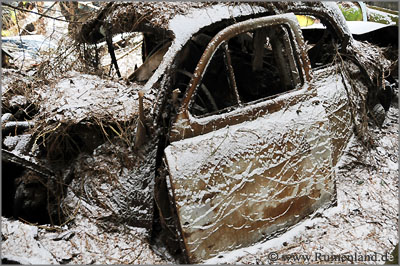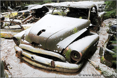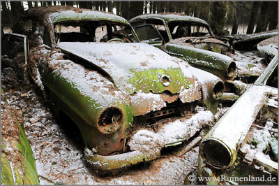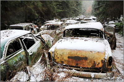Nahe des kleinen Dorfes unterhalb des Waldes befand sich ehemals eine amerikanische Militärbasis. Die Soldaten sind längst abgezogen, ihre hier entsorgten Autos der 60er und 70er Jahre zeugen jedoch noch immer von ihnen. Einem Autoliebhaber und Sammler muss es bei diesem Anblick das Herz zerreißen; meines jedoch ließen die alten, schneebedeckten Karosserien aufgrund der außergewöhnlichen Fotomotive höher schlagen.