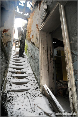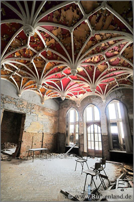 Meine erste Empfindung war eine Mischung aus Wut, Entsetzen und Hilflosigkeit. Ich wusste von alten Fotos, wie das Schloss einst eingerichtet war. Ich wusste von Fotos aus dem Internet, wie die Innenräume noch vor einigen Jahren aussahen. Ich wusste, dass inzwischen vieles kaputt, entwendet und zerfallen war. Aber mit solch einem Ausmaß hatte ich, erst Recht in Anbetracht des noch stattlichen äußeren Erscheinungsbild des Schlosses, nicht gerechnet. Es war in einziges Trauerspiel. Nicht primär in Hinblick auf den heutigen Zustand, sondern diesbezüglich insbesondere wegen den mutwilligen Zerstörungen in den letzten Jahren. Jüngstes Beispiel ist der verzierte Handlauf des einst massiven Treppengeländers, der vor genau einem Jahr zumindest in Teilen noch erhalten und vor Ort war.