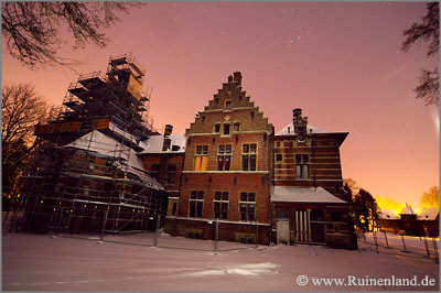 Zum Abschluss des heutigen Tages machten wir einen Abstecher zum 1555 erbauten Kasteel M. Jahrelang ungenutzt, befindet es sich derzeit in Restauration. Es war zwar bereits dunkel, doch die Lichter aus dem Ort zauberten in der Langzeitbelichtung per Stativ einen orange- bis magentafarbenen Nachthimmel aufs Foto, während ich das Schloss selbst per Taschenlampe anleuchtete.