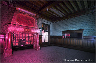 Ich versuchte meinen Ärger beiseite zu wischen und war schließlich auch froh, es zumindest ins Innere des Schlosses geschafft zu haben. Ärgerlicherweise ging Miri ausgerechnet hier das Stativ kaputt, noch bevor ich ein einziges Foto damit machen konnte. Nochmals den Berg runter und hoch, um meines aus dem Auto zu holen, kam nicht in Frage; das wäre zeitlich unklug gewesen und hätte zudem die Gefahr entdeckt zu werden erhöht. Ganz davon abgesehen hatte ich auch keine Lust auf doppelte Anstrengung. So blieb mir nur übrig, die ISO-Zahl meiner Kamera hochzuschrauben, um im Schloss ohne Stativ, aber auch ohne Blitz fotografieren zu können.