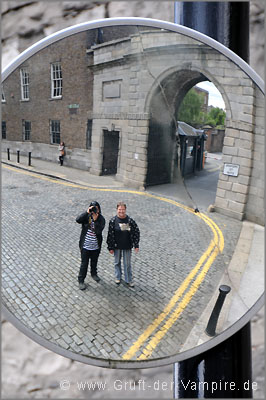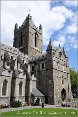 Bereits 1095 wurde sie an der Stelle einer noch älteren Kirche erbaut, ihr Name geht auf einen dänischen Heiligen zurück. Auf der mit Holzschnitzereien verzierten Orgel im Inneren soll 1742 Georg Friedrich Händel gespielt haben. Der Kirchensaal an sich war sehr schlicht und aufgrund moderner Umbauten recht langweilig. Um so interessanter waren die unterirdischen Gewölbe, die Birgit und ich im Rahmen einer Führung besichtigten. Auch Bram Stoker, der Autor von Dracula, soll die Katakomben besucht haben. In den Gewölben befanden sich mehrere Gruften mit übereinander gestapelten Särgen, Totenschädeln und Mumien. Durch die trockene Luft, einer konstanten Temperatur und den relativ hohen Methangas-Gehalt in der Luft (die Kirche steht auf einem ehemaligen Sumpfgebiet) wurden die Körper mumifiziert. In einer der Grabkammern waren die hölzernen Särge zerfallen, sodass die Mumien mit ihrer gelbbraunen, lederartigen Haut zu sehen waren. Es handelte sich hierbei um die Leichen eines Mannes und zweier Nonnen. In anderen Grabkammern befanden sich die sterblichen Überreste eines Kindes, das vor 150 Jahren verstarb, sowie die Gebeine eines großen Mannes, der ein Kreuzfahrer gewesen sein soll. Die berühmtesten Leichnahme in der Gruft von St. Michan's sind jene der Gebrüder Sheares. Bis vor einigen Jahren brachte man stets frische Blumen an ihr Grab, doch durch die von den Blumen ausgehende Feuchtigkeit verfaulten die Särge. Die Gebrüder Sheares wurden daraufhin neu eingesargt und Blumen aus den Grüften verbannt.