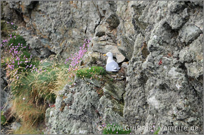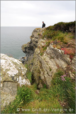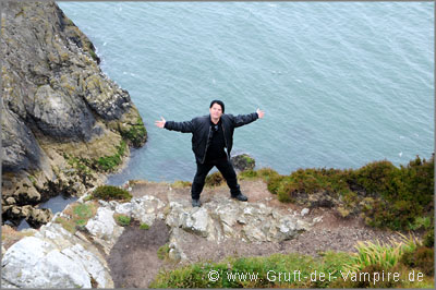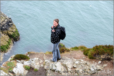 Nach etwa 30 Minuten Fußweg kamen wir an der Steilküste an, wo Möwen um die tiefer gelegenen Felsen flogen, der Wind allerdings noch stärker blies. Doch zumindest der Regen hatte inzwischen aufgehört und wir wurden mit imposanten Klippen und einer tollen Aussicht auf Howth mit Hafen, der gegenüber liegenden Insel "Ireland's Eye" und die Martello-Türme belohnt (zwei von insgesamt 164 kleinen Befestigungen, die das britische Empire zwischen 1804 und 1814 zur Zeit der Napoleonischen Kriege errichtete). Da ich nicht schwindelfrei bin, wurde mir am Abgrund der Klippen doch etwas "anders" zumute, was mich trotzdem nicht daran hindern sollte, mich für ein Foto an den Rand zu stellen...