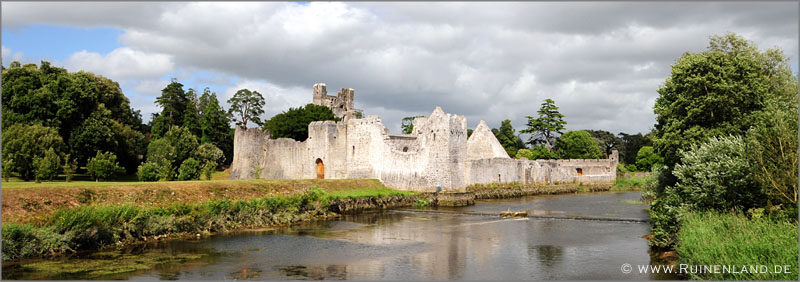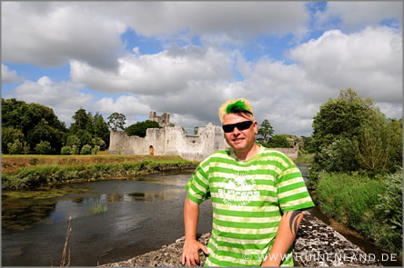 Nach einem Stopp in Castleisland, dessen Burgruine leider auf Privatgrund steht und nicht besichtigt werden kann, fuhren wir weiter nach Adare. Der Verkehr in dem kleinen Städtchen war extrem, ein großes Kinderfest mitten im Ort tat sein Übriges, um ein schnelles Vorankommen zu verhindern. Zu unserer Enttäuschung konnten die Ruinen von Desmond Castle (erbaut um 1190, erstmals urkundlich erwähnt 1240, zerstört 1657) und der dahinter liegenden Grey Abbey nur mit Führung nach Vorheriger Anmeldung im "Adare Heritage Centre" im Stadtzentrum besichtigt werden. Nochmals in diesem Verkehr zurück und das Centre zu suchen hätte jedoch zu viel Zeit gekostet, so dass wir uns notgedrungen mit Fernaufnahmen von der Brücke aus begnügten.