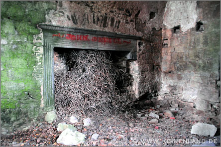 Hinter der Ruine, auf die Grabkreuze ihre Schatten warfen, grasten Kühe, an denen ich mich mit gebührendem Abstand vorbei schleichen musste, um auch rückseitige Aufnahmen machen zu können. Dort waren noch die Fundamente zweier Rundtürme der einstigen Burg zu sehen.