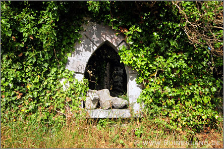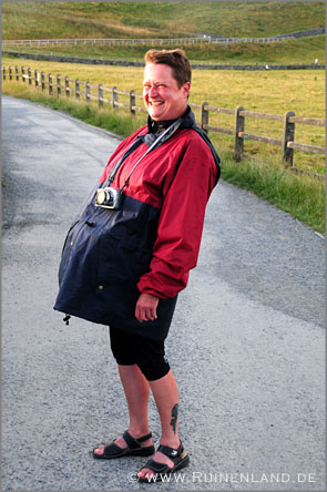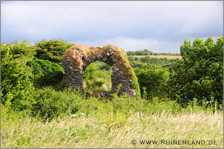 Der Zugang zur nächsten Ruine, dem im 15. Jahrhundert erbauten Bealaclugga Castle, war indes komplizierter. In einer kleinen Bucht gelegen, führen keine Wege (bzw. bestenfalls Trampelpfade) zu ihr, so dass Birgit und ich uns durch fieses Dornengestrüpp kämpfen mussten, um sie überhaupt zu erreichen. Zu allem Überfluss lag in den Büschen auch noch eine tote Kuh, von der jedoch nur noch Haut und Knochen übrig waren. Für den Rückweg wählten wir deshalb einen etwas weiteren Weg, in der Hoffnung, dass dieser einfacher sei. Dort verfolgten uns schließlich jedoch "vermeintlich Fleisch fressende Killerkühe" und zum Schluss mussten wir auch noch eine äußerst brüchige, mit Dornenranken bewachsene Mauer überklettern.