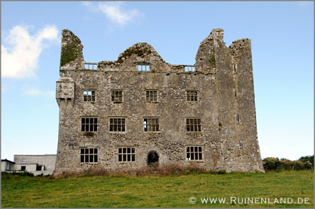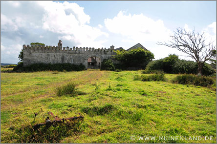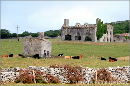 So schnell, wie Regen und Wolken gekommen waren, verschwanden sie auch wieder, während wir über Finavarra zur Küste fuhren. Die Wellen brachen sich rauschend an den Steinen, vor der sich der wuchtige Martello Tower erhob (einer von insgesamt 164 kleinen Befestigungen, die das britische Empire zwischen 1804 und 1814 zur Zeit der Napoleonischen Kriege errichtete). Zwar führte ein geknotetes Seil zum hochgelegenen Eingang des Turmes, ich verzichtete aber darauf, mich dort hoch zu quälen. Auf dem Rückweg zur Hauptstraße legten wir noch einen Fotostopp an den Ruinen von Finvarra Manor ein. 1768 als prunkvolles Haus von William Skirrett erbaut, stehen sie heute auf Privatgrund und können wegen Einsturzgefahr nicht besichtigt werden.