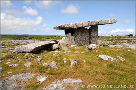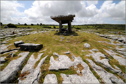 Über Serpentinen, welche die unwirklich anmutende Felslandschaft durchschnitten, erreichten wir den Poulnabrone Dolmen (Pulnabrone Dolmen), auch "the hole of the sorrows" genannt. Der Dolmen ist ein Megalithgrab, bei dem zwei aufrecht stehende Steine (Orthostaten) gemeinsam mit dem gewaltigen, 3,65 m langen Deckstein eine Kammer bilden. Der Poulnabrone Dolmen wurde in der Jungsteinzeit zwischen 3800 v.Chr. und 3200 v.Chr. erbaut. Bei Grabungen im Jahr 1985 entdeckte man hier zudem Reste älterer Bestattungen bis zurück ins Jahr 5100 v.Chr.