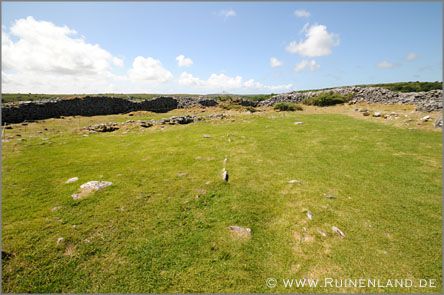 Während Birgit im Auto wartete, besichtigte ich anschließend noch das Caherconnel Stone Fort, verbunden mit einer interessanten Audioführung samt Film über die Ringfestungen der Burren. Mit gut 40 m Durchmessern haben die einst sechs Meter hohen und bis zu vier Meter dicken Wände heute noch eine Resthöhe von drei Metern. Ursprünglich diente Caherconnell vermutlich einer wohlhabenden Familie dazu, ihr Vieh bei feindlichen Einfällen zu schützen, wurde später als Befestigung aber mindestens bis ins 15. Jahrhundert hinein genutzt. Radiokarbon-Untersuchungen belegten sogar menschliche Überreste von 1560-1630. Bei archäologischen Untersuchungen fand man 30 m südöstlich des Forts zudem eine Kammer mit Werkzeugen und Keramiken aus der mittleren Bronzezeit (2000-1500 v.Chr.).
