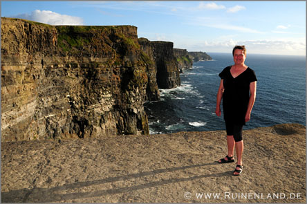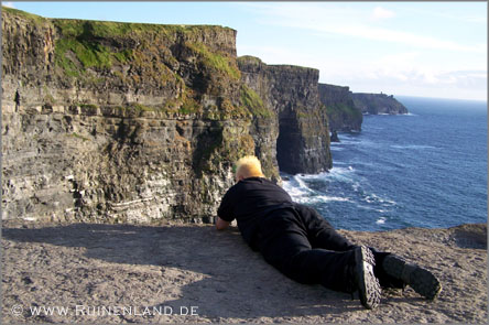 Wenig begeistert waren wir von den 8,- Euro Parkgebühren, aber zumindest waren aufgrund der späteren Stunde nicht mehr all zu viele Touristen vor Ort. Tagsüber wäre das sicherlich anders gewesen. Nach einem Abstecher ins Besucherzentrum, das bis 21.00 Uhr geöffnet hatte, erkundeten Birgit und ich die Klippen; zumindest hatten wir dies vor. Zu unserer Enttäuschung verhinderten jedoch hohe, an die ausgebauten Wege angrenzende Steinplatten eine klare Sicht in Tiefe. Wider jeder Vernunft und entgegen der Verbotsschilder überkletterten wir diese schließlich und wurden mit gigantischen Ausblicken belohnt. Auch wenn hierfür eine weitere Absperrung zu überklettern gewesen wäre, hätte ich gerne noch den Moher Tower besucht. Hin und zurück insgesamt 8 Km Fußweg waren mir für die kleine Ruine dann aber doch definitiv zu weit.