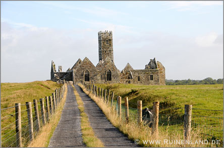 An der nächsten Ruine, dem Moyne Castle aus dem 16. Jahrhundert, legten wir aufgrund erneut über uns hereinbrechenden Regens nur einen kurzen Stopp ein. Zudem wurde die Burg als Kuhstall genutzt und war wegen der Hinterlassenschaften dieser Tiere eh nicht sauberen Fußes zu betreten. Zurück am Auto, fuhr zu unserer Verwunderung genau jener Touri-Bus an uns vorbei, dem wir zuvor an der Ross Errily Friary begegnet sind. Da hatten die Teilnehmer dieser Rundreise nun wirklich kaum Zeit, sich die Klosteranlage in Ruhe anzuschauen, für deren Besichtigung wir bereits gut zwei Stunden benötigten. Grund genug, auch zukünftig lieber auf eigene Faust loszufahren, anstatt an solch einer Bustour teilzunehmen. Auf wenig Zeit und ständig Leute im Bild kann ich dann doch gerne verzichten!