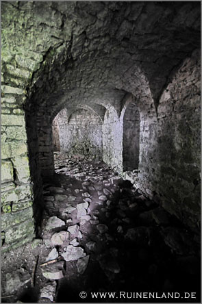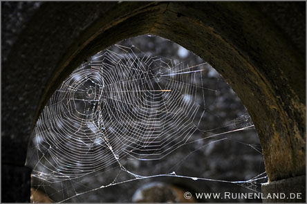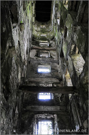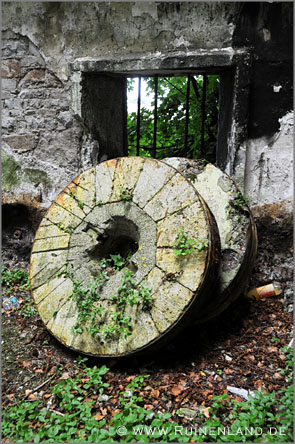 Vom Brunnen aus überstiegen Birgit und ich zwei brüchige Mauern und schreckten dabei einen Hasen auf. Ich wollte gerade eine kleine Kuppe zur Mühle hinaufsteigen, als sich mir dahinter eine riesige Kuhherde mit mehreren Bullen entgegen stellte. Ganz toll, wo mir diese Tiere aus der Nähe eh nicht ganz geheuer sind. Um die Mühle überhaupt sehen zu können, mussten wir uns deshalb auf "gut gedüngtem" Waldboden durch die Büsche schlagen. Machte die einstige Mühle von außen noch einen halbwegs stabilen Eindruck, hatten wir im Inneren hingegen eher das Gefühl, dass die Mauern gleich über uns zusammenbrechen würden. Als in diesem Moment auch noch Wind und Regen einsetzten, verließen wir das Gebäude deshalb lieber zügig.