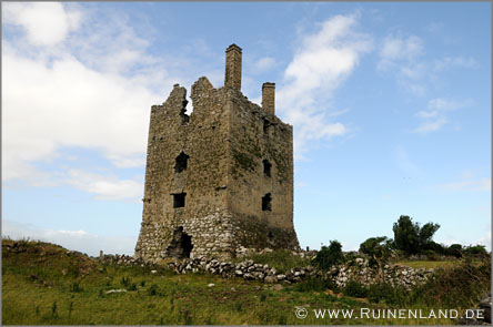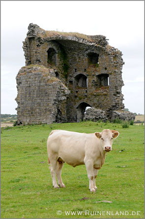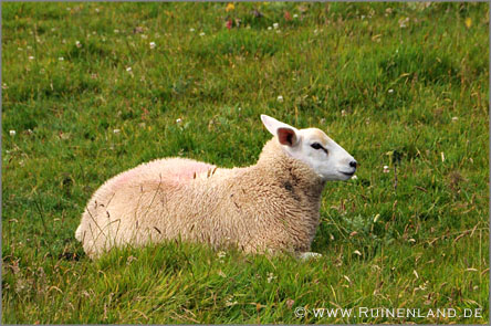 Da die Kirchenruine von Kinlough mit einem Baugerüst umgeben war, beschränkten wir uns dort auf den Besuch der gleichnamigen Burgruine. Wie so oft wurde das umliegende Ackerland als Weidefläche genutzt und war umzäunt. Um nicht zurück zum Gatter laufen zu müssen, kletterte ich kurz entschlossen über den Zaun - mit dem Resultat, dass ich am Stacheldraht hängen blieb, meine Hose zerfetzte und mir schmerzhaft die Innenseite der Oberschenkel aufriss...