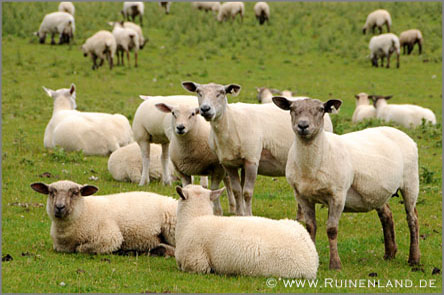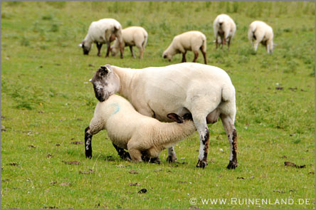 Nach der kurzen Besichtigung der alten Mühle und der kleinen Kirchenruine von Shrule deckten wir uns in einem Dorfladen mit kalten Getränken ein und fuhren anschließend weiter zum Killernan Castle, einst bewohnt von George Blake. Da vor der Ruine mehrere Kühe grasten, verzichtete ich darauf, näher heran zu gehen. Birgit erfreute sich zwischenzeitlich an den vielen Schafen auf der benachbarten Weide.