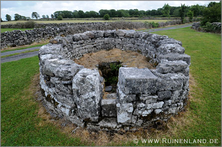 Auf den nächsten Ort, Neale, war ich besonders gespannt. Bei meinen Recherchen entdeckte ich dort gleich mehrere interessante Bauten: einen alten Brunnen, eine Tempelruine, die Ruinen einer Mühle, eine Kirchenruine und zuletzt (womit man in Irland wohl kaum rechnet) eine Pyramide. Wir parkten auf einem Feldweg neben dem Brunnen. Während Birgit ein Pferd streichelte, ging ich die vier flachen Stufen zum Wasserloch hinunter, um von dort eine Flasche zu entfernen, die mich für das Foto störte. Lange hielt ich meine Hand jedoch nicht ins Wasser, denn wie ich mit einem Schrecken feststellte, lebten darin Blutegel, von denen auch einer an der Flasche hing (selbige flog sogleich in einem hohen Bogen auf die Wiese...). Hätte eines dieser Dinger anschließend an meiner Hand gehangen, hätte ich hyperventiliert. ;-)
