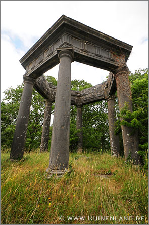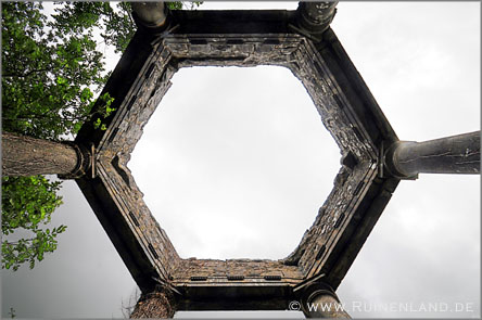 Erneut Mauern überkletternd gingen wir anschließend zu dem "unvollendeten Tempel", der mit seinem Aufbau aus sechs Säulen an den Baustil der "Dorischen Ordnung" angelehnt war. Erbaut wurde er vor 1865 von John Browne, Baron of Kilmaine, zu Ehren seines ersten Titels als "Lord Mount Temple". Genutzt wurde der "Tempel", in dessen Sockel sich ein Gewölbe mit vier steinernen Stützpfeilern befindet, jedoch nicht für religiöse Zwecke, sondern das Monument wurde von den Damen der angrenzenden Hofgüter als Treffpunkt zum Plaudern und Relaxen auserkoren. Mmh, recht banal also; ein etwas "mystischerer" Hintergrund hätte mir besser gefallen.