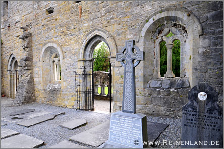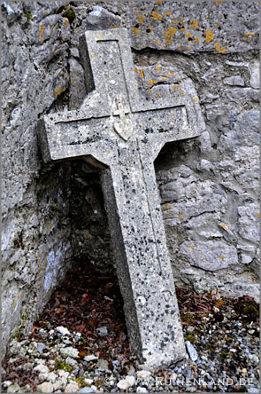 Ich parkte extra etwas von der Ross Errily Friary entfernt, um nicht das Auto auf meinen Fotos zu haben. Als Birgit und ich uns der Ruine näherten, waren wir verwundert darüber, dass schon am frühesten Morgen jemand in den Mauern Musik zu machen schien. Um so erstaunter waren wir, als wir feststellten, dass lediglich der Wind durch die Fenster, Kreuzgänge und Hallen wehte und dabei diese zauberhaft anmutenden Melodie wie von Harfen und Klangschalen erzeugte. Unbeschreiblich schön; man muss dieses Klangspiel selbst erlebt und gehört haben, um es glauben und nachempfinden zu können. Wir hielten uns gut zwei Stunden in den alten Mauern auf und just als wir diese verließen, bog ein voll besetzter Touri-Bus um die Ecke. Wie gut, dass wir am Morgen so früh vom Guesthouse losgefahren sind, denn die Menschenmasse aus dem Bus zerstörte die friedliche Atmosphäre der Klosterruine doch merklich.