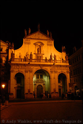 Prag bei Nacht. Links das Klementium, rechts die Statue des heiligen Nepomuk auf