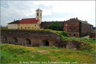 Aufgrund des starken Regens am Mittag hatte ich die zum Schluss eingeplante, etwas abgelegene Burgruine bei Sub Cetate aus dem Programm gestrichen und fuhr stattdessen noch zur Festung in Oradea (Großwardein). Aufgrund mehrspuriger Hauptverkehrs-Einbahnstraßen und Baustellen fand ich die Zufahrtsstraße nicht. Ich fuhr deshalb zum verschlossenen Osttor auf der Rückseite und ging mit Alex von dort um die Festungsmauern herum zum Eingangsportal auf der Westseite. Eine mehr oder weniger typische Festung mit sternförmigem Grundriss und starken Eckbastionen, erinnerte die Anlage, in der u. a. die Kunstakademie der Universität untergebracht ist, zum Teil eher an eine Fabrikruine. Ein Großteil der mehrstöckigen Gebäude stand leer, dunkle Fenster reihten sich an den im Inneren ruinösen Ziegelbauten aneinander. Jetzt wunderte es mich auch nicht mehr, dass im Internet fast ausschließlich immer nur die gleichen Ansichten von Kirche und der äußeren Bastionen zu sehen sind.