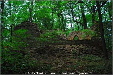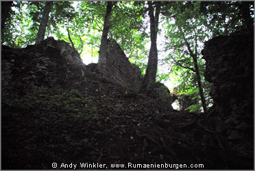 Unsere letzte Burgruine für diesen Tag lag nahe Alesd, genauer gesagt bei Pestis. Durch Zufall hatte ich sie vor geraumer Zeit im Internet entdeckt und wusste von dort, dass sich auf dem Berg nur wenige hundert Meter von einander entfernt gleich drei Ruinen befinden: Eine Burg (Cetatea Sinteului), eine Kapelle und ein Wachturm. In Pestis fragte ich einen älteren Mann nach dem richtigen Weg, dem ich schließlich etwa 5 Km in den Wald folgte. Dass er aufgrund des Regens aufgeweicht, aber auch im trockenen Zustand nur schwer befahrbar wäre, brauche ich wohl kaum zu erwähnen. Nichts desto trotz wäre ich die 10 Km auch bei früherer Tageszeit sicherlich nicht gelaufen und fuhr deshalb ungeachtet der Straßenverhältnisse einfach weiter, bis der Weg an einer Schranke endete. Ich stellte den Wagen davor am Seitenrand ab und wir gingen zu Fuß weiter. Bereits nach wenigen Metern hatte sich so viel Schlamm an meinen Füßen gesammelt, dass jeder Schritt doppelt so schwer wurde, aber zumindest war gleich rechts hinter der Schranke der Burgberg. Der Weg war im Grunde nicht weit und bei trockenem Wetter wäre er sicherlich auch gut zu laufen gewesen; an diesem Tag versank ich jedoch regelrecht im Matsch und rutschte trotz Stock, den ich mir gesucht hatte, immer wieder nach unten weg. Nach etwa 20 - 30 Minuten kamen wir auf halber Höhe an und vor uns stand romantisch verwachsen die Kapellenruine mitten im Wald. Ob sie einst zur Burg gehörte, ist mir nicht bekannt, hierfür muss ich mir erst die mir vorliegenden ungarischen Texte übersetzen lassen.