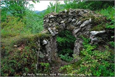 Ich war mittlerweile etwas entnervt und hatte die Burgruine bereits abgeschrieben, was mich doch ärgerte. So gingen wir zurück zur Kapelle und folgten dahinter einem verwitterten Pfad zum Wachturm. Dieser war jedoch selbst gar nicht mehr zu erreichen, nur noch ein paar geringe Mauerreste waren auf einem unzugänglichen Felsen zu sehen. Wir waren bereits auf den Abstieg eingestellt, als uns auf der Rückseite der Kapellenruine ein kaum mehr als solcher erkennbarer Pfad auffiel. Trotz der bereits einbrechenden Dunkelheit (optisch war es bereits dunkler, als auf den Fotos) wollte ich nichts unversucht lassen und so streiften wir über Felsen ein Stück bergab durch die Büsche. Ich wollte schon umdrehen, als ich auf der anderen Seite eines verwitterten Grabens die dunklen Schatten der Burgmauern entdeckte. Ich rief Alex, der oben gewartet hatte, zu "Ich hab' sie gefunden!", um gleich darauf freudig das kurze Stück zur Ruine hinauf zu klettern. Das war eine Burg nach meinem Geschmack - mitten im Wald, schön verwildert und noch mit reichlichen Mauerresten. Torbögen und Fensteröffnungen waren noch gut erkennbar und immer wieder ragten Mauerstücke vom Felsen empor. Im hinteren Teil der Ruine klaffte ein etwa 1,5 Meter breites Loch im Boden und vom oberen Burgfelsen hatte man einen tollen Blick auf den gegenüberliegenden, bewaldeten Berg. Vor dem inneren Tor auf der Rückseite zweigte eine kleine Höhle in den Fels ab. Ich packte meine Taschenlampe aus und kroch hinein, als mir eine Fledermaus entgegen flatterte. Ich hatte noch nie so viele Fledermäuse in so wenigen Tagen gesehen und es sollte auch nicht die Letzte sein. Im Inneren der niedrigen Höhle war am bearbeiteten Stein zu sehen, dass sie einst in die Burg integriert gewesen sein musste, offensichtlich ist der Fels an dieser Stelle aber irgendwann abgesackt oder in Teilen eingestürzt.