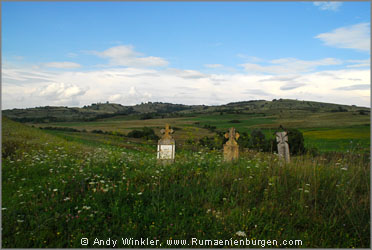 Bei der Ruine der Abtei von Carta (Kerz) legten wir einen kurzen Fotostopp ein und fuhren anschließend quer durch die Mitte Siebenbürgens. Am Horizont war die Kulisse der im Nebel liegenden Karpatenberge zu sehen, am Wegesrand standen einsam auf einem Hügel drei Kreuze.