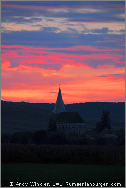 Auf dem Rückweg fütterte ich wieder einige Hunde, während hinter der Kirche von Soars die untergehende Sonne den Himmel in intensiven Farben aufleuchten ließ. Auf der Fahrt nach Viscri (Deutsch-Weißkirch) begann es erst zu regnen, schließlich setzte ein starkes Gewitter ein. Ein Reh sprang über die Straße, von einem Pfosten flog eine Eule weg; die Bäume am Wegesrand bogen sich im Sturm und Blitze zuckten über den Nachthimmel. Ein unheimliches Szenario. Vor uns gab es plötzlich einen Schlag und ein helles Licht blitze auf. Nur ein Stück weiter lag brennendes Holz auf der Straße, offensichtlich hatte ein Blitz eingeschlagen. Ich war doch etwas erleichtert, als wir kurze Zeit später Viscri erreichten und der Regen wieder nachließ.