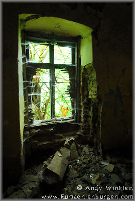 Auf der Weiterfahrt fiel mir ein Turm über dem Ort Camarasu (Kammerisch) ins Auge. Das konnte nur ein Schloss sein, so dass ich Attila bat, dieses anzusteuern. Es befand sich auf einem Firmengelände, aber wir bekamen auf Nachfrage die Genehmigung, es zu besichtigen. Im Inneren der Ruine waren noch Reste von schmuckvollen Tapeten zu sehen, ringsherum hatte man Firmengebäude angebaut, die mittlerweile jedoch ebenfalls leer standen oder bereits in Trümmern lagen.