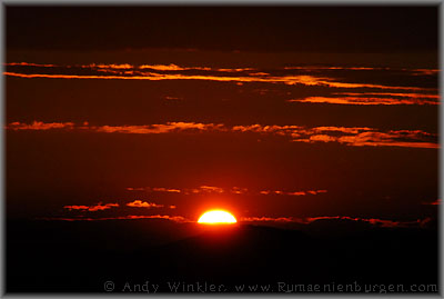 Wir gingen erneut zurück zum Auto und fuhren nun zum mittlerweile dritten Berg, von dem uns gesagt wurde, dass sich dort die Ruine befände. So weit, so gut, im Wald jedoch ein gewohntes Bild: Ein Weg führte nach links, einer nach rechts und ein dritter geradeaus. Jetzt war guter Rat teuer. Wir entschieden uns für links - bei meinem Glück mit Sicherheit die steilste Aufstiegsmöglichkeit. Oben angekommen von der Burg jedoch weit und breit keine Spur, stattdessen zwei weitere Wege. Und inzwischen wurde es auch bereits langsam dunkel. Wieder folgten wir dem Weg nach links, aber auch dieser führte nicht zur "Cetatea Fetei", sondern auf ein weitläufiges Wiesenplateau. Ich gab auf. Inzwischen war es für die weitere Suche ohnehin zu spät, stattdessen genoss ich von hier oben den Sonnenuntergang, bevor wir uns in der Dunkelheit den Weg zurück zum Auto suchten. Übrigens: Wie ich wieder zuhause im Internet feststellen musste, sind wir gerade mal etwa 300 Meter an der Ruine vorbei gelaufen; sie lag nicht links, sondern rechts. Nun ja; bei meinem nächsten Besuch in Cluj weiß ich jetzt zumindest, wo sich die Burg befindet und muss nicht mehr suchen.