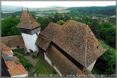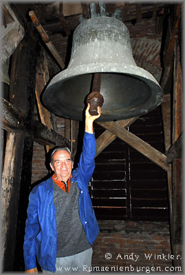 Die Eltern meiner Internet-Bekannten freuten sich, mich kennen zu lernen und nach einem kurzen Gespräch, bei dem man uns alte Fotos der Kirchenburg und des gestohlenen Flügelaltars zeigte, führte uns der Vater (Andreas) zur Kirchenburg hinauf. Die äußere und innere Ringmauern waren noch zu sehen, wenngleich letztere in Teilen eingestürzt war, zudem Reste von zwei Wehrtürmen. Eine liebevolle und informative Führung bis hinauf in den Glockenturm, welcher über steile Leitern zu besteigen war. Somit hatte der Tag trotz aller Rückschläge zumindest noch ein gelungenes Happy End.