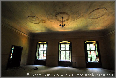 Normalerweise sind leer stehende Adelshäuser in Rumänien entweder zugänglich (und kein Mensch kümmert sich um interessierte Besucher) oder das Betreten ist offensichtlich untersagt. Hier war beides nicht der Fall. Zumindest aber durfte ich meine Fotos behalten, auch wenn ich leider nicht alles gesehen hatte.