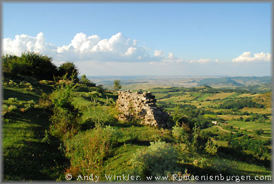 Vorbei an einem Unfall mit unübersehbarem Totalschaden (wohl resultierend aus einem der für mich unverständlichen Überholmanöver mancher Rumänen) ging es nach Tilisca (Tilischka), wo sich gleich zwei Ruinen befinden: zum einen eine dakische Befestigung und zum anderen der Rest einer Burg. Der Weg zu den dakischen Ruinen aus der Zeit um 100 vor bis ca. 100 nach Chr. war gut markiert, oben war eine Hinweistafel angebracht und die Mauerreste waren zudem schützend überdacht. Nun, solche Befestigungen werden gepflegt, da viele Rumänen der Ansicht sind, von den Dakern abzustammen. Ruinen von Burgen, die meist aus ungarischer Zeit stammen, lässt man hingegen meist unbeachtet verfallen. Dem entsprechend suchte man ein Hinweisschild am Weg zur Burgruine auch vergeblich, wenn man weiß, wo sie liegt, ist sie aber gut zu finden. Der Forstweg war größtenteils befahrbar, auch wenn ich hier und da erst mal größere Äste zur Seite räumen musste. Aber zumindest konnten wir uns so knapp die Hälfte des Aufstiegs sparen und mussten nur noch rund 20 Minuten laufen. Neben geringen Mauerresten, Erdwällen und Vertiefungen stand von der Burg aus dem 14. Jahrhundert jedoch lediglich noch ein kleines Mauerstück.