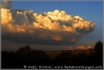 Die Wolken wurden von der Abendsonne angestrahlt, als wir Dobarca verließen und die letzten Kilometer bis zu unserem Guesthouse in Garbova (Urwegen) fuhren. Dort rief ich Andreas Thiess an, den ich übers Internet kennen gelernt hatte und der uns am nächsten Tag zur Ruine der alten Burg von Garbova führen wollte. Wir verabredeten uns für in einer Stunde, während dessen ich schätzungsweise drei Tonnen Müll und leere Flaschen aus unserem Auto entsorgte.