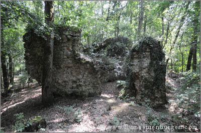 Vorbei an einer kleinen Ölpumpe mitten im Wald fanden wir anhand der Satellitenbilder, auf denen die Pumpe und die Wege erkennbar waren, schließlich die Burgstelle von Felnac. Diese war jedoch derart dicht mit Brennnesseln und Dornen verwachsen, dass sie mit dünner Sommerkleidung leider unmöglich begehbar war. Auch die Umrisse der Mauern, die man auf der Satellitenaufnahme sah, konnte man vor Ort aufgrund des Bewuchses bestenfalls erahnen. Nichts desto trotz kann ich nicht verleugnen, dass es ein gewisses schönes Gefühl ist, als erster Fotos hiervon online zu haben.