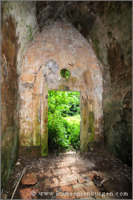 Ohne die handgezeichneten Karten mit Wegbeschreibung in englisch hätten wir die Gruft sicherlich nicht so schnell gefunden, aber auch mit ihnen war der kurze Weg nicht ganz einfach. Selbst die Fahrt nach Poieni war abenteuerlich; so stand am Straßenrand ein Autowrack, aus dem bereits ein Baum wuchs. Hinter Poieni stellten wir den Wagen ab und gingen zu Fuß weiter. Hierbei überquerten wir eine schmale und mehr als morsche Brücke aus modrigen losen Planken, schlugen uns durch eine mannshohe Wiese und erreichten so den am Bach gelegenen Eingang zur Gruft, von dem mehrere Efeu-Ranken wuchsen. Entgegen meiner Information lag der Leichnam nicht frei zugänglich darin, was mich auch mehr als verwundert hätte, sondern in einer tiefer gelegenen Grabkammer, die in den 90ern wiederholt vermauert wurde. Aus dieser war jedoch ein kleines Stück heraus gebrochen, so dass wir dennoch einen Blick hinein werfen konnten. Der verzierte Metallsarg mit der Einfassung des einstigen Glasdeckels war noch zu sehen, ebenfalls Beinknochen, welche durch die starke Feuchtigkeit auf fast unnatürliche Weise gänzlich geschwärzt waren. Fotos der Gebeine möchte ich an dieser Stelle jedoch nicht veröffentlichen.