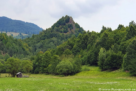 Obwohl ich in den vergangenen Nächten viel zu wenig Schlaf bekommen hatte, wachte ich heute noch vor dem Klingeln des Weckers auf, fühlte mich erfreulicherweise aber trotzdem relativ fit. Da es in der Unterkunft kein Frühstück gab, starteten wir entsprechend zeitig zur nur 6 km entfernten Cetatea Soimilor (Falkenburg / Burg Falkenstein) bei Bixad. Vorbei an einem halb eingestürzten Bunker führte uns der Weg durch den Wald auf ein mit Wildblumen bewachsenes Plateau, und von dort weiter über einen steilen Pfad auf den 717 hohen Bergkegel oberhalb des Flüsschens Olt.