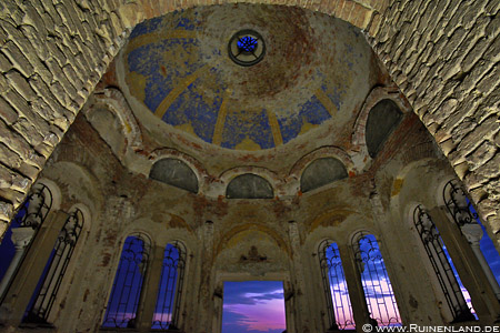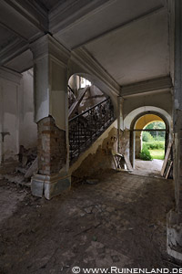 Vor dem Schloss stand ein kahler, knochiger Baum und von außen machte das Anwesen einen recht düsteren Eindruck, was mir für meine Fotos sehr entgegen kam. Im Inneren waren leider bereits mehrere Bereiche eingestürzt und der Westflügel nicht mehr begehbar. Gegen Ende meiner Erkundung stieß ich im Erdgeschoss auf ein Zimmer, dessen Tür sich nicht öffnen ließ. Auf der anderen Seite dieses Raumes war eine weitere Tür, die durch ein großes, quer liegendes Holzbrett versperrt war. Neugierig geworden räumte ich es zur Seite, öffnete die Tür und blickte geschockt auf ein paar nackte, gelblich-schmutzige Füße. Im ersten Moment dachte ich tatsächlich an eine Leiche, mein Herz schlug mir bis zum Hals. Glücklicherweise war dem jedoch nicht so, sondern es handelte sich um einen Obdachlosen, der sich zuvor nicht bemerkbar gemacht hatte, bis er urplötzlich einen lauten Schrei losließ. Erschrocken verließen wir daraufhin schnellen Fußes das Schloss, ohne dass der Mann uns folgte.