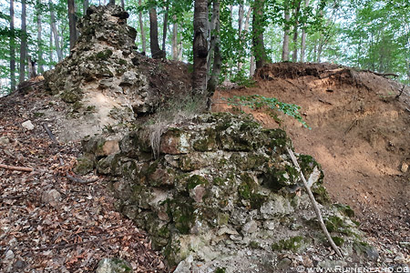 Gräben umgebenen Burgstelle nur noch wenige Mauerreste.