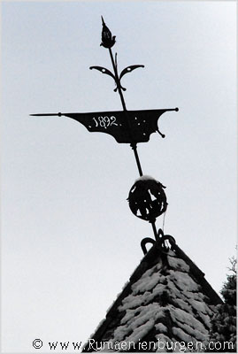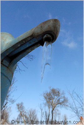 In Nusfalau wollte ich anschließend das dortige Bánffy-Schloss besichtigen. Wie sich vor Ort herausstellte, erstreckt sich das großflächige Anwesen über mehrere Grundstücke. Im Garten vor dem Haupthaus, in dem sich eine Zahnarztpraxis befindet, stand ein rostiger Wasserhahn mit Eiszapfen, in den Nebengebäuden sind u.a. eine Diakonie sowie ein Kindergarten untergebracht.