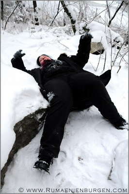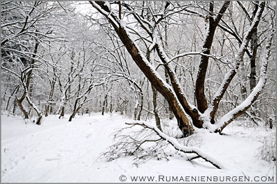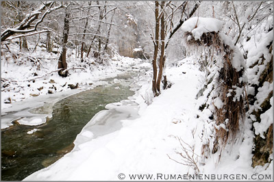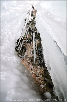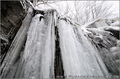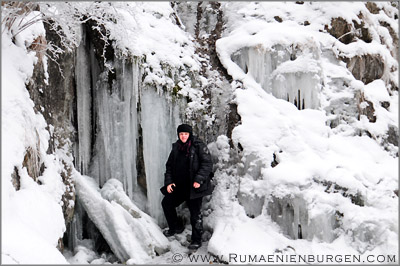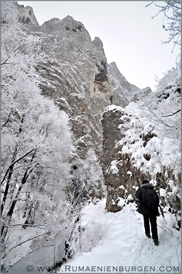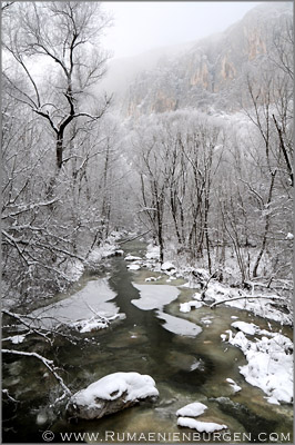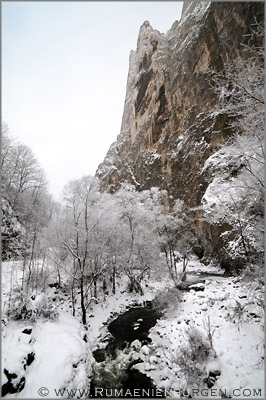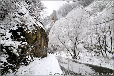 Ursprünglich war nun die Erkundung einer stillgelegten Fabrik eingeplant, die ich auf einer meiner vergangenen Touren entdeckt hatte. In Turda (Thorenburg) angekommen wurde jedoch schnell klar, dass hiervon mittlerweile nur noch ein nacktes Stahlbeton-Skelett steht, welches wenig lohnenswert erschien. Deshalb zögerte ich nicht lange und fuhr weiter nach Cheia (Burgort). Die dortige Cheile Turzii war bereits im Sommer immens schön (siehe Reisebericht von 2007), so dass sie sicherlich auch bei Schnee und Eis ihren Reiz haben würde. Meine Befürchtung, dass die Schlucht im Winter gesperrt sein könnte, erfüllte sich glücklicherweise nicht, wenngleich wir die letzten Kilometer nicht mehr fahren konnten (bzw. hierfür Schneeketten hätten aufziehen müssen). Also parkten wir am Hügel gegenüber der Schlucht und gingen das letzte Stück zu Fuß, wurden für den Weg durch eine buchstäbliche Winterwunderwelt aber mehr als entlohnt.