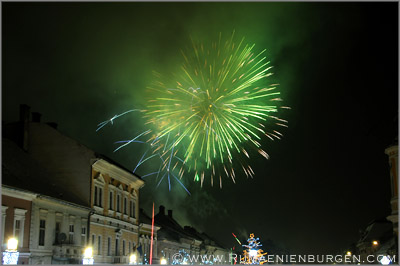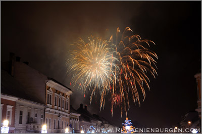 Um kurz vor Mitternacht machten Miri und ich uns auf den Weg zum Marktplatz, um uns das dortige Feuerwerk anzuschauen. Hierfür hätte ich mir allerdings besser ein paar Ersatzschuhe mitgenommen; denn die Pikes mit absolut null Profil waren für die vereisten Gehwege gänzlich ungeeignet! Ich konnte mich kaum auf den Beinen halten und rutschte die ganze Zeit durch die Gegend, während Miri laut fluchend Mühe hatte, mich irgendwie oberhalb des Bodens zu halten. ;-)
