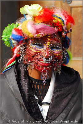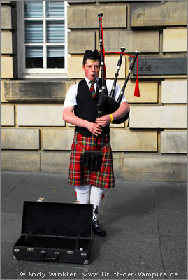 Gleich darauf gingen wir in die Stadt, schließlich wollten wir den Tag noch ausnutzen. Nach dem Aufstieg zum Castle liefen wir die Royal Mile entlang, quasi die Touristenstraße Edinburghs. Mehrere Geschäfte mit Whiskey, Schottenröcken, Postkarten und dergleichen reihten sich vor historischer Kulisse aneinander und aus den Gassen hörte man Dudelsack-Musik. Auf dem Platz vor der Kirche trafen wir die Frau mit den laut Guinnes Book meisten Piercings der Welt, eine äußerst farbenfrohe Gestalt und in jedem Fall ein Foto wert. :-) Gut gelaunt erzählte sie mir, dass in vier Tagen RTL ein Interview mit ihr aufnehmen würde.