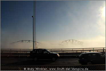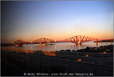 Auf der Rückfahrt nach Edinburgh leuchtete die Forth Bridge über der Bucht im Sonnenuntergang. Wie jeden Abend kauften wir noch Essen und Getränke bei "unserem Inder" im kleinen Shop beim Guesthouse und spielten eine Runde Rommé (diesmal gewann Birgit).