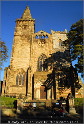 In Dunfermline angekommen kaufte ich mir erst mal zwei Landkarten, bevor Birgit und ich zur dortigen Klosterruine und Abtei gingen. Auf dem Friedhof hingen Spinnennetze an verzierten Kreuzen, die im Sonnenlicht leuchteten; mehrere Eichhörnchen sprangen über die Wiese und auf einem Grabstein sonnte sich ein Pfau. Bis auf einen Meter ließ er uns an sich herankommen, offensichtlich war er äußerst entspannt und Menschen gewöhnt.