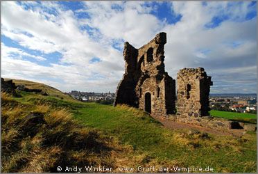 Vom Hollyrood House gingen wir hinüber zu den Salisbury Hills. Links der Cracks, eine klippenartige Felswand, steht die Ruine der St. Anthony's Chapel, zu welcher wir als erstes hinauf stiegen. Von hier konnte man bis auf die tiefer gelegene Bucht schauen. Unterhalb der Kapelle, welche im 15. Jahrhundert erbaut und bereits Ende des 16. Jahrhundert wieder aufgegeben wurde, befindet sich ein See, an dem mindestens zwei Dutzend Schwäne im Gras saßen.