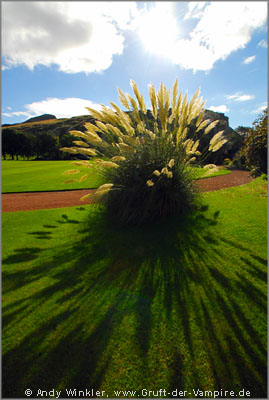 Als nächstes fuhren wir zum Parliament von Edinburgh, welches in meinem Reiseführer als "Highlight" bezeichnet wird. Warum, ist mir jedoch nicht ganz klar. Den Stilmix aus verschiedenen Formen und Materialien mögen andere vielleicht interessant finden, ich hingegen fand es einfach nur hässlich, so dass ich nicht mal ein Foto davon machte. Aber unser eigentliches Ziel lag auch gegenüber des Parliaments: Der Palace of Holyroodhouse. Das Gebäude befindet sich in Besitz der Queen, kann in Teilen in Verbindung mit einer Audioführung jedoch besichtigt werden. Die meisten Besucher machten, wohl aufgrund des hohen Eintrittspreises, lediglich Fotos durchs Tor. Wir jedoch gingen hinein, nachdem ich mir in einem kleinen Laden ein Buch über schottische Geistergeschichten und Spukorte gekauft hatte. Den im vorderen Teil völlig überteuerten Touri-Shop mit allerlei "Queen-Kitsch" hinter uns gelassen, umrundeten wir den Palast sowie die angrenzende Ruine der Hollyrood Abbey erst mal von außen. Im Park sind noch Fundamentreste der alten Abtei zu sehen, von wo aus man einen schönen Blick auf die nahe gelegenen Salisbury Cracks hat. Gelbweißes Pampasgras warf einen tollen Schatten auf den akkurat geschnittenen Rasen vor den Palastmauern. Im Inneren des Palastes, mit seinen schmuckvoll verzierten Räumen, hohen Stuckdecken, großflächigen Wandgemälden und historischen Möbeln, herrschte striktes Fotoverbot. Da bin ich wohl "zufällig" ab und zu an meinen Auslöser gekommen ;-)