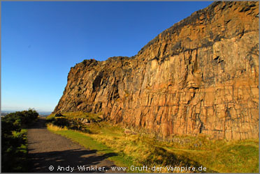 Salisbury Cracks, Edinburgh. Birgit stand oben (der kleine rote Punkt auf dem