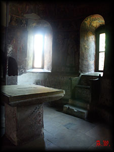 Dort betraten wir die Ruinen des Fürstenhofes, von welchem aus sowohl Vlad Tepes, als auch sein Vater, Vlad Dracul, einst regiert haben sollen. In der Kapelle war Andrea wenig begeistert davon, dass sie, im Gegensatz zu mir, mit ihrer kleinen Kamera nicht alles so aufs Bild bekam, wie sie es wollte - egal, wie sie es auch versuchte.